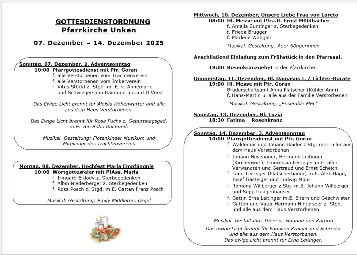Jeden 2. Mittwoch im Monat um 08.00 Frühmesse in der Pfarrkirche Unken mit anschließendem Frühstück im Pfarrsaal.